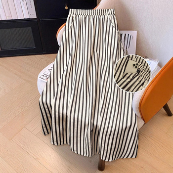 กระโปรงผ้าชีฟองลายทางลำลองสำหรับผู้หญิงไซส์พิเศษสบายๆในฤดูร้อนย้อมด้วยเส้นด้ายรอบเอวธรรมชาติ